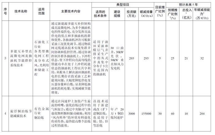 多能互補型直流微電網及抽油機節(jié)能群控系統(tǒng)技術目前推廣比例5%,未來5年預期推廣比例達到25%,總投入21億元,年碳減排能力達32萬噸。