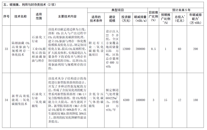 碳捕集、利用與封存類技術2項,應用于石油化工行業(yè)的有陸相油藏二氧化碳高效驅油與規(guī)模埋存一體化技術、新型高效低能耗二氧化碳捕集技術。