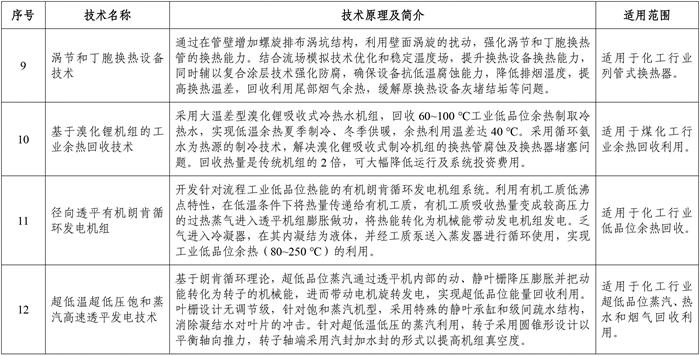 石化化工行業(yè)節(jié)能降碳技術(shù)共有12項(xiàng),分別是高效尿素合成工藝技術(shù)、橡膠串聯(lián)密煉技術(shù)、全重力平衡油氣水處理一體化技術(shù)、五塔四效甲醇精餾技術(shù)、乙烯裂解爐節(jié)能陶纖襯里材料、硫鐵礦制酸系統(tǒng)協(xié)同利用有機(jī)廢硫酸節(jié)能降碳技術(shù)、煉油加熱爐節(jié)能降碳成套技術(shù)、加壓氣相淬冷法制三聚氰胺大型化成套技術(shù)、渦節(jié)和丁胞換熱設(shè)備技術(shù)、基于溴化鋰機(jī)組的工業(yè)余熱回收技術(shù)、徑向透平有機(jī)朗肯循環(huán)發(fā)電機(jī)組、超低溫超低壓飽和蒸汽高速透平發(fā)電技術(shù)。