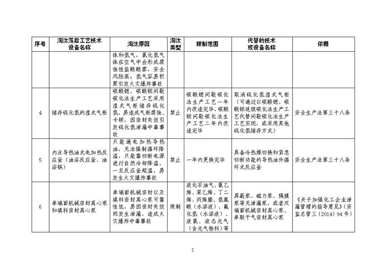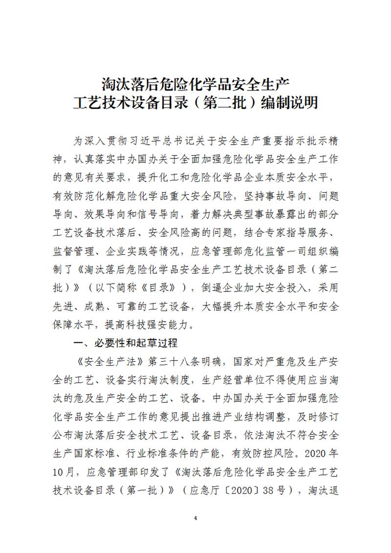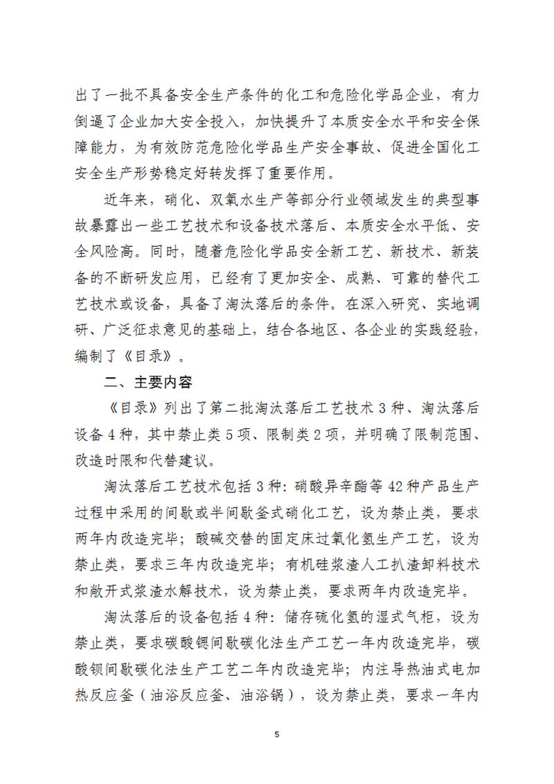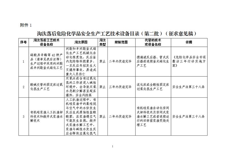 為認(rèn)真落實(shí)中共中央辦公廳、國務(wù)院辦公廳《關(guān)于全面加強(qiáng)危險(xiǎn)化學(xué)品安全生產(chǎn)工作的意見》有關(guān)要求,提升化工和危險(xiǎn)化學(xué)品企業(yè)本質(zhì)安全水平,有效防范化解危險(xiǎn)化學(xué)品重大安全風(fēng)險(xiǎn),應(yīng)急管理部?;O(jiān)管一司組織制定了《淘汰落后危險(xiǎn)化學(xué)品安全生產(chǎn)工藝技術(shù)設(shè)備目錄(第二批)》(征求意見稿)和編制說明(見附件1)。