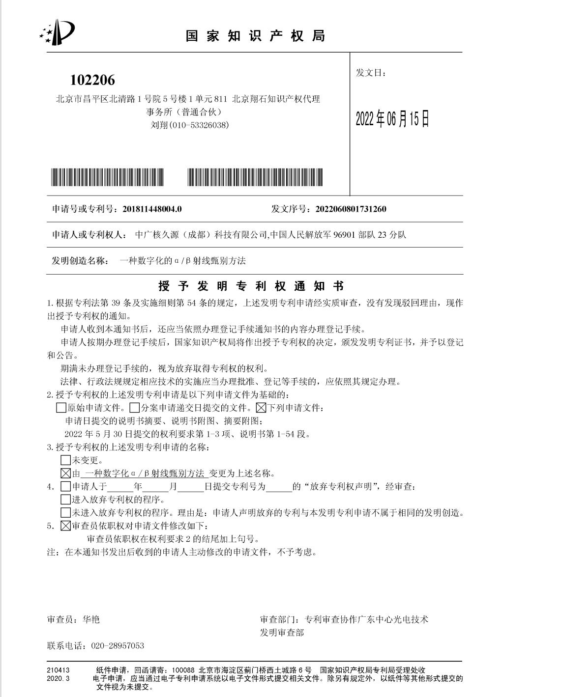 近日,中廣核久源(成都)科技有限公司(以下簡稱“久源公司”)收到國家知識產權局“授予發明專利通知書”,明確由久源公司主持的發明專利《201811448004.0 一種數字化的α/β射線甄別方法》(專利號:201811448004.0)申請通過實質審查,榮獲發明專利授權。